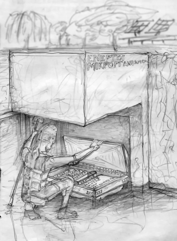 Αν υπάρχει όμως κάτι που μπορεί να ενισχύσει τη διαύγεια των αναμνήσεων που ανακαλώ, είμαι σίγουρος πως θα το βρω κάποτε στα ιερογραφικά χαρακτικά που αφήνει αυτή τη στιγμή, ο ίδιος ο Τσόκυ, σε κάποιο διατεμάχιο Γης. Χαρακτικά που θα χαρώ κάποια στιγμή να συμπληρώσουν τα κενά στις ιδέες που τώρα προμελετώ και αρχίζω να καταγράφω, ανυπομονώντας για την επιστροφή του. Όταν αυτό συμβεί, του επιφυλάσσω έκπληξη για το τέλος και ας με συγχωρέσει προκαταβολικά για την περίεργη νέα ελληνική διάλεκτο που χρησιμοποιώ μα τόσο πολύ ταιριάζει στο διαστημικό μας περιβάλλον.”