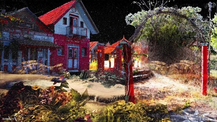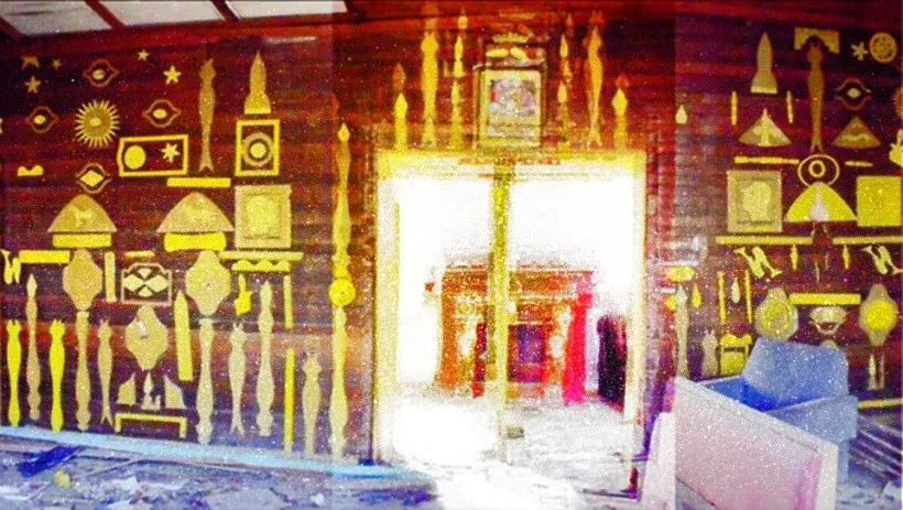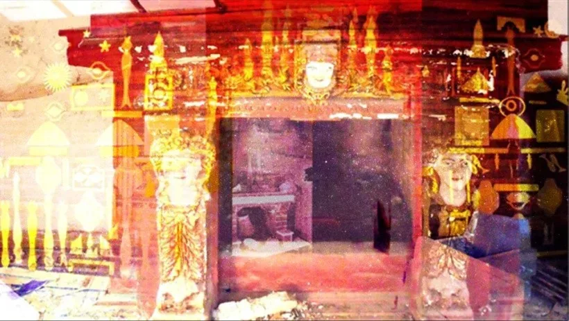 Μπαίνει στο εσωτερικό του κεντρικού κόκκινου και μπλε κτίσματος και βρίσκει τον ναό αδειανό, μα η φωτιά στην κεντρική εστία σιγοκαίει προδίδοντας απουσία συγκεκριμένης παρουσίας.
